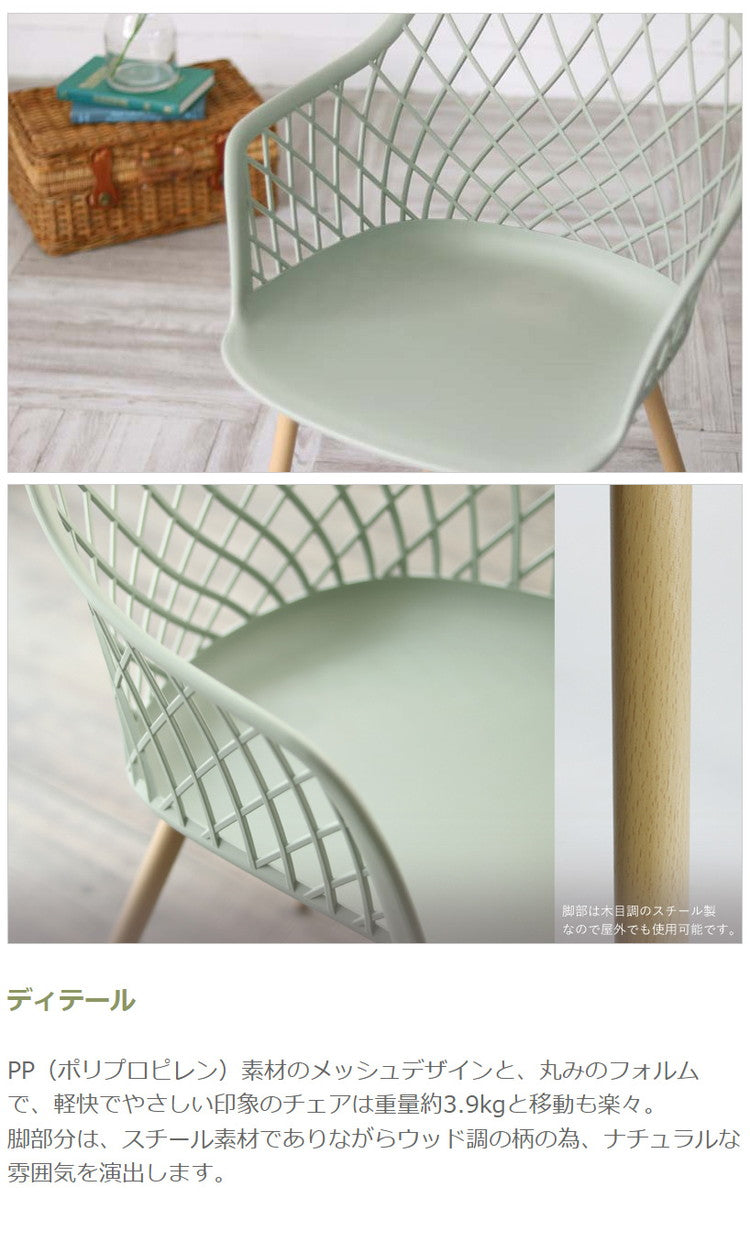 PP(ポリプロピレン)素材のメッシュデザインと、丸みのフォルムで、軽快でやさしい印象のチェアは重量約3.9kgと移動も楽々。