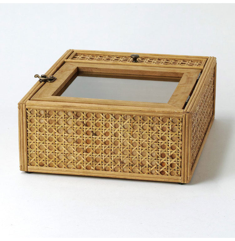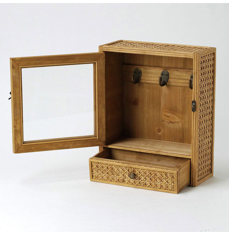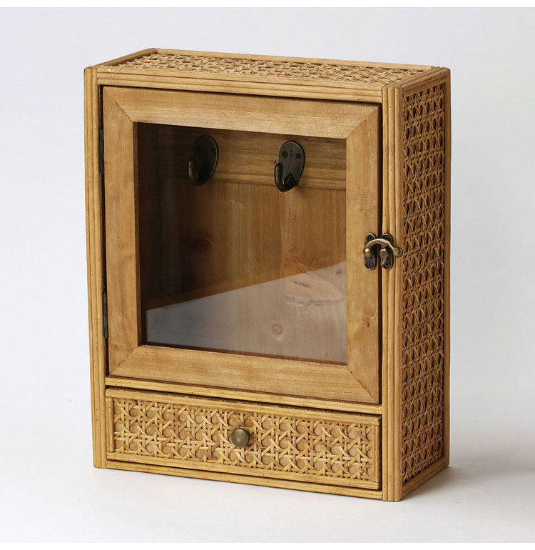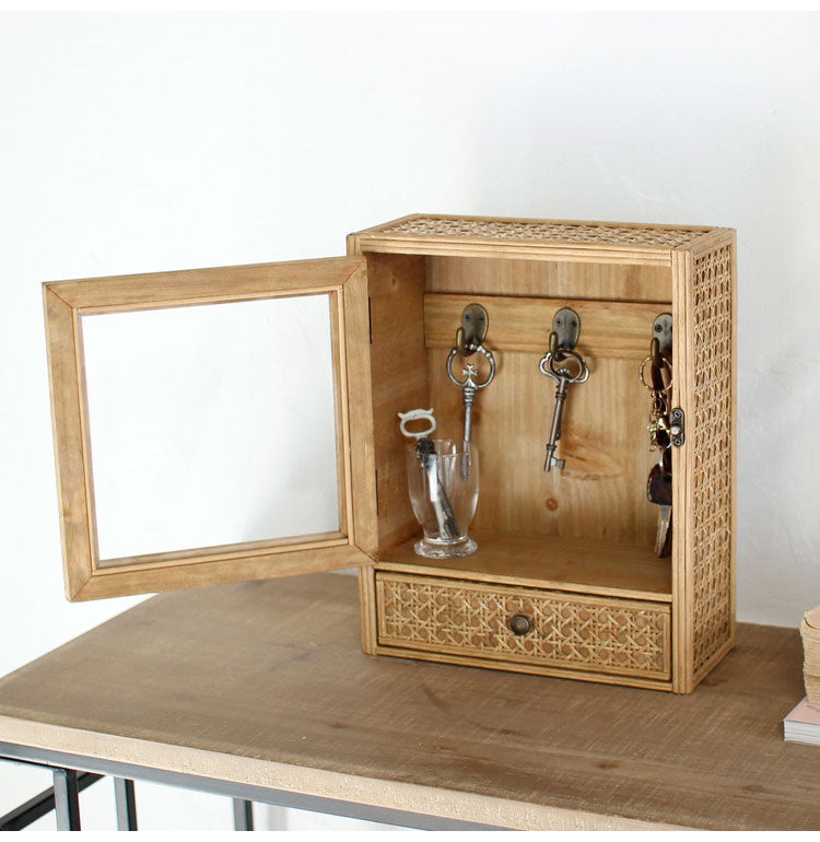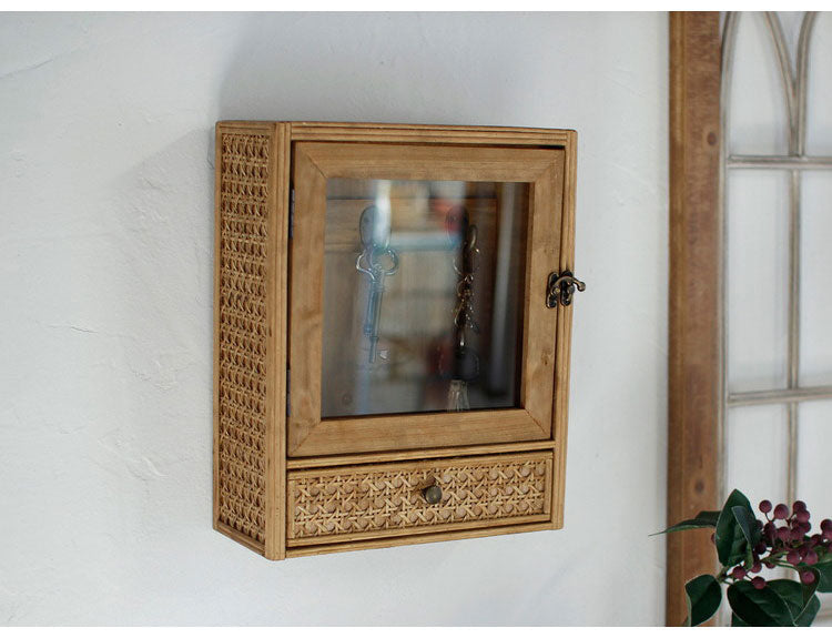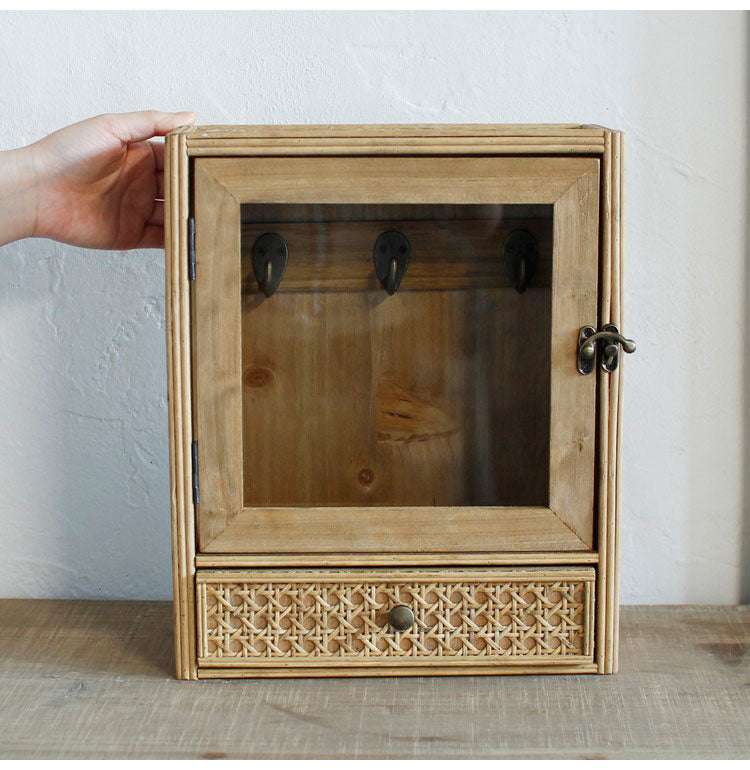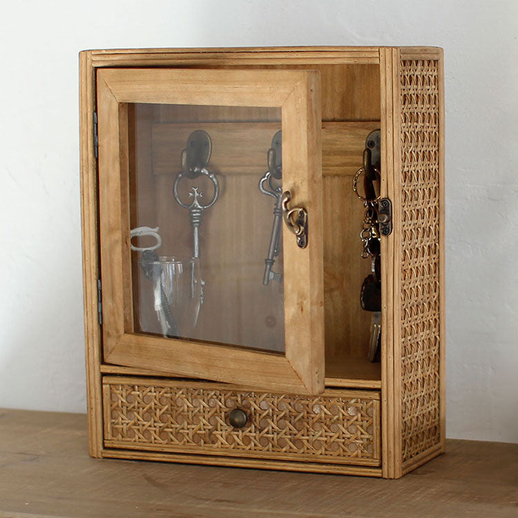 ラタン ガラス扉付き キーボックス フック 引出し 扉収納 キーフック ボックス 箱 小物入れ 収納 籐 アジアン家具 韓国インテリア ナチュラル ラタンカントリー おしゃれ