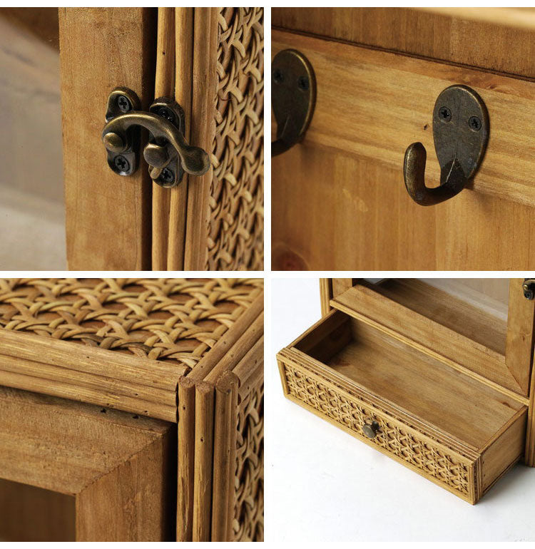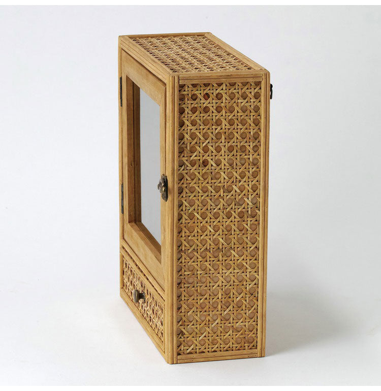 ■日常的に使う収納ボックスは、こだわりの天然素材のものを選びたい。ラタンの装飾がさりげなくおしゃれに仕上げています。■片扉のミニキャビネットの中にはフックが付いており、アクセサリーや鍵など実用的なものを入れるのに便利です。■背面にフックがあるので壁にかけても使えます。
