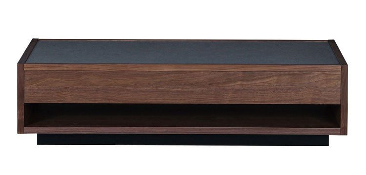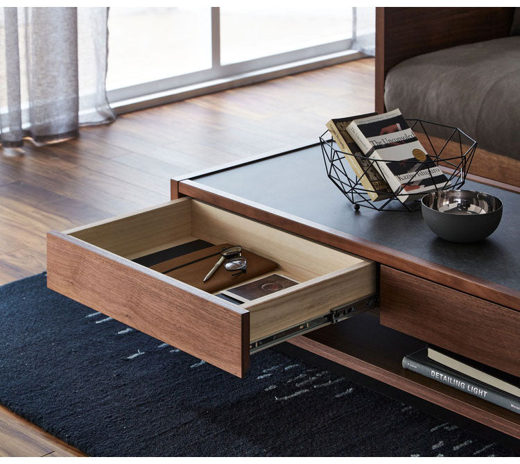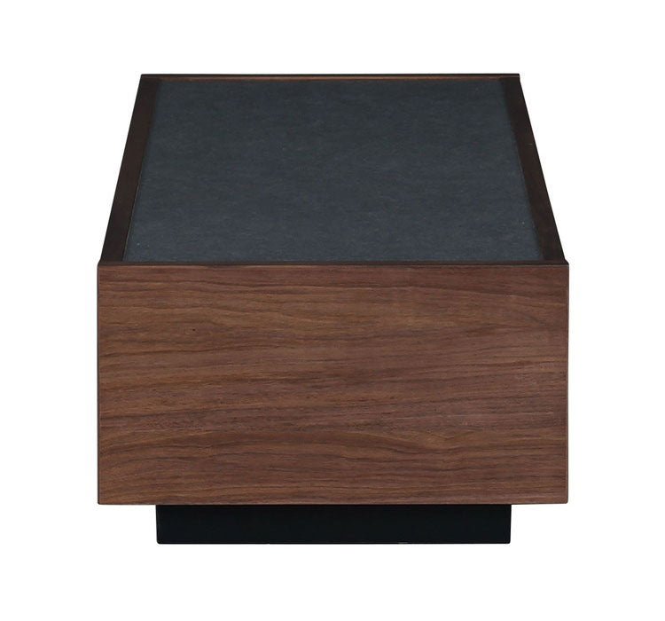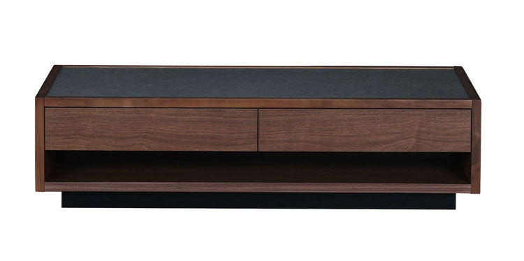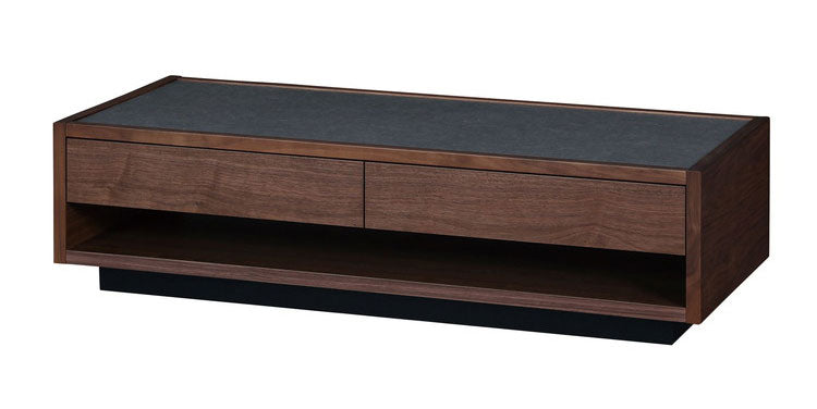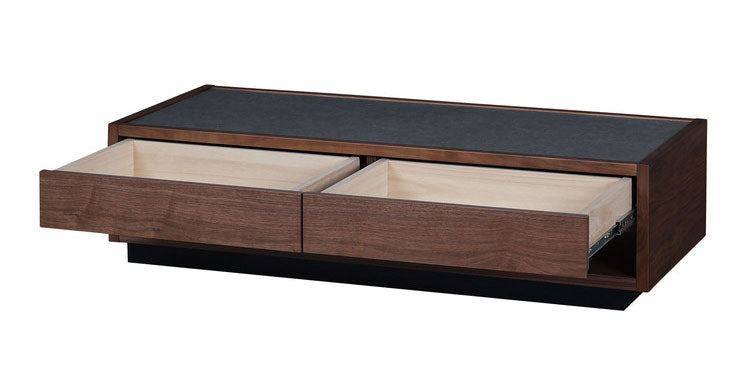 本体は、ウォールナットでシンプルにまとめあげ、二杯の深引き引出しを用意し、収納力も高い仕様です。