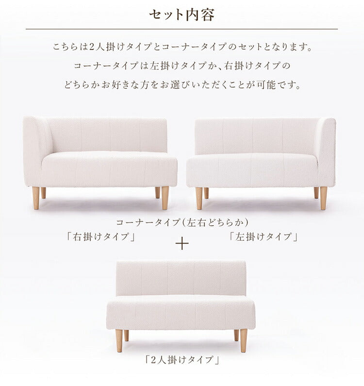 2人掛けタイプとコーナータイプのセットです。コーナータイプは左掛けタイプか右掛けタイプのどちらかお好きな方をお選びいただくことが可能です。