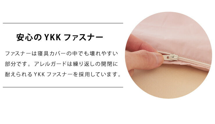 ダニも通さないほどの細かい目の生地で、表面に凹凸が無いこのアレルガードは、薬剤を一切使わずにダニの侵入を防げるので薬に対するアレルギーなどがある人にも安心して使っていただけます。