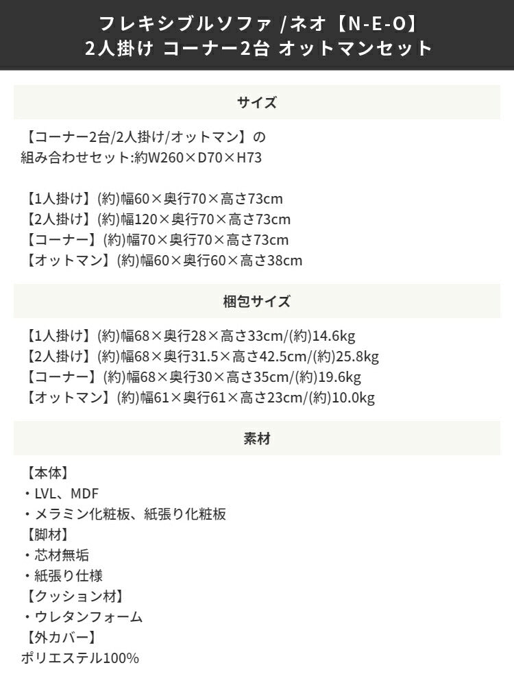 ソファ4点セット 2P コーナーソファ×2 オットマン 4点 組み合わせ 3人掛け ファブリック 布 ブルー 青 ナチュラル すのこ床 おしゃれ モダン ボックスソファ フレキシブルソファ【ネオ/N-E-O】(代引不可)