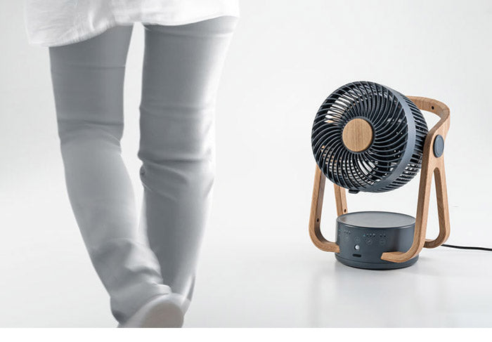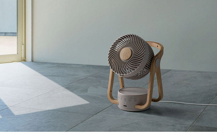 質感の高い木目調のフレームと柔らかな本体カラーの組み合わせでデザイン家具のようなインテリア性の高さと、持ち運びがしやすいデザインが特徴のサーキュレーター。