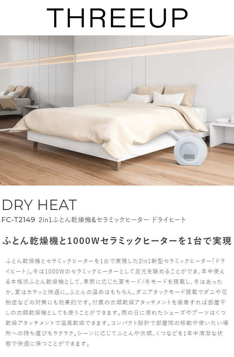 2in1ふとん乾燥機&セラミックヒーター ドライヒート FC-T2149 ホワイト スリーアップ 布団乾燥機 ヒーター セラミック 人感センサー ダニ対策 花粉対策 衣類乾燥 衣類乾燥機 くつ乾燥 靴乾燥 暖房(代引不可)