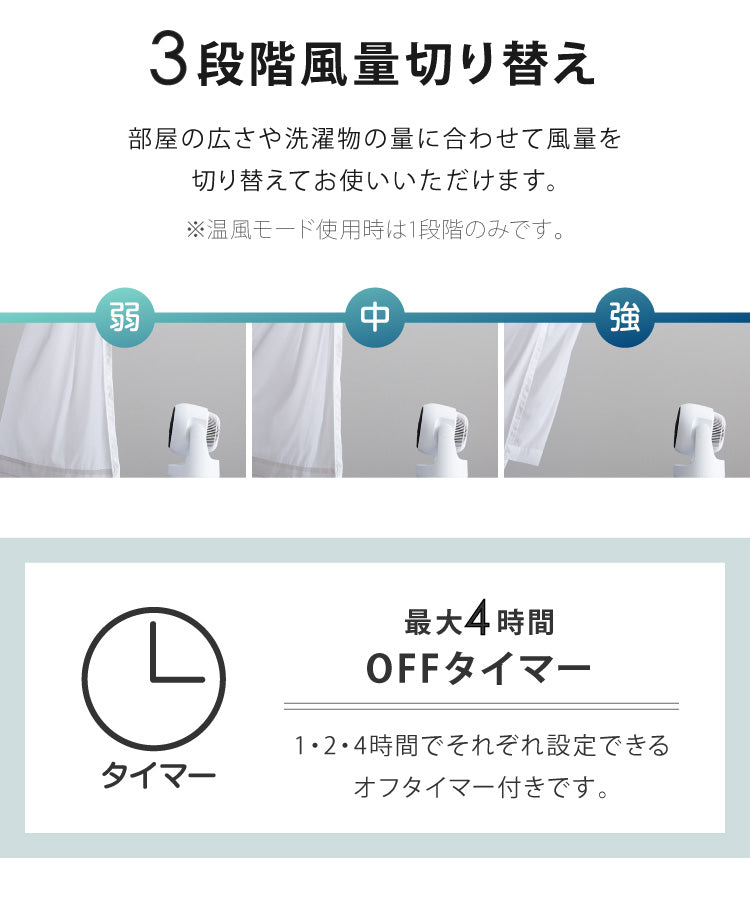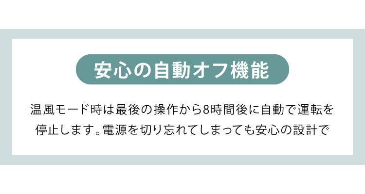 温風/暖房モード、衣類乾燥モード、メモリー機能、滅灯機能、自動オフ機能8時間(温風モード時)