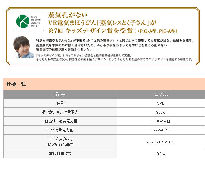 TIGER タイガー 蒸気レスVE電気まほうびん とく子さん 大容量5.0L PIE-A500-K ブラック