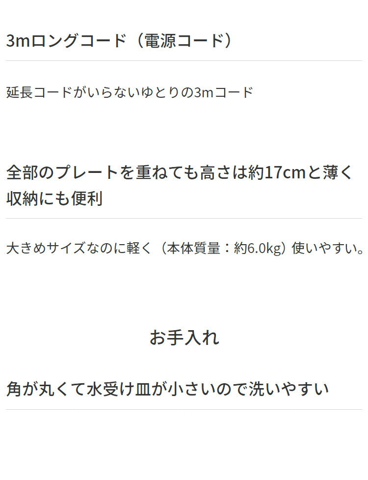 サイズ(約)(cm)幅×奥行×高さ:48.4×35.8×12.7(平面プレートをセットした状態でふたをしたとき) 53.8×35.8×12.7(平面プレートをセットした状態でふたをして、温度調節器をセットしたとき)