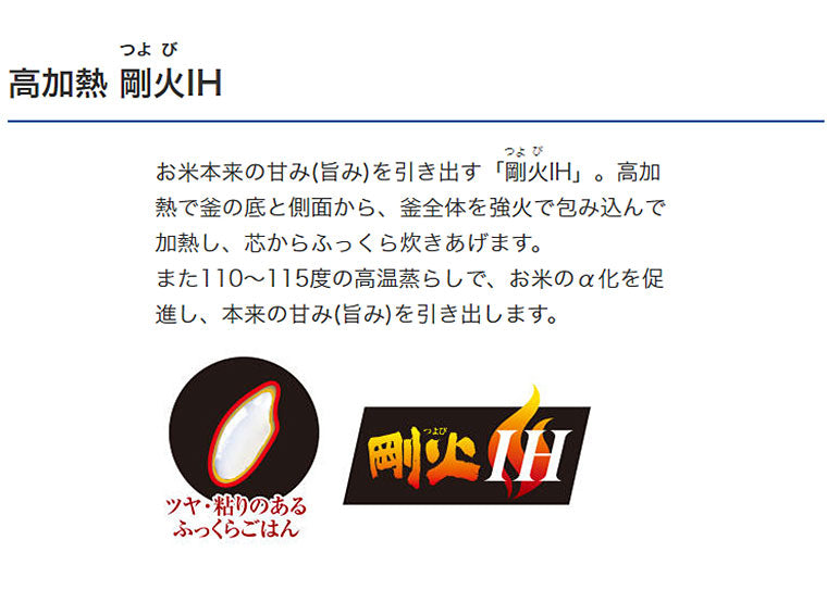 お米本来の甘みを引き出す「剛火IH」。130℃(※)の高加熱で釜の底と側面から、釜全体を強火で包み込んで加熱し、芯からふっくら炊き上げます。