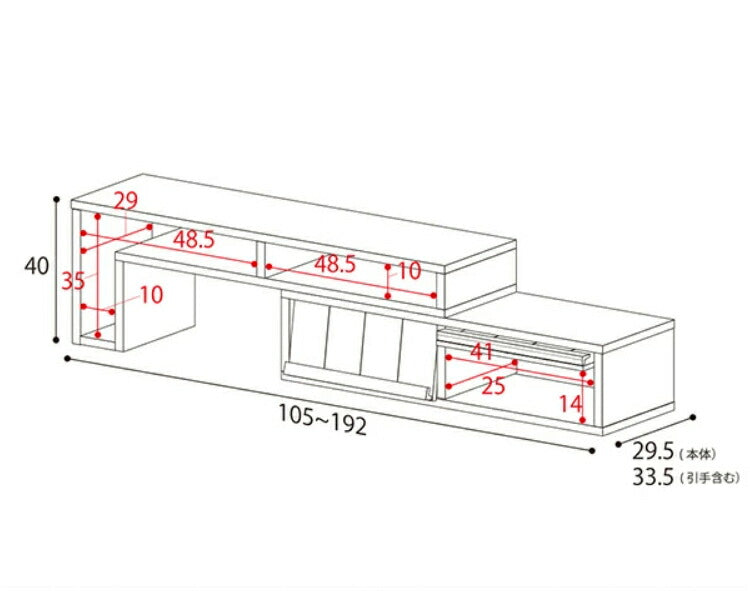 外寸:幅105~192×奥行き33.5<引き手含む>×高さ40(cm)