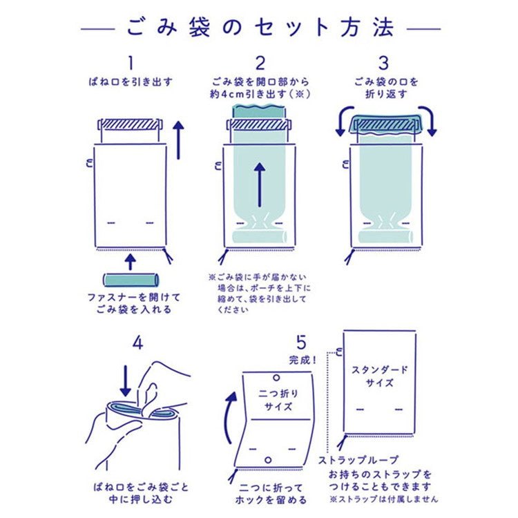 外出中にもごみを捨てられる便利な「ごみ箱ポーチ」です。専用のごみ袋をセットし、バネ口を開いてごみをポイッ。ポーチやカバンの中が汚れず衛生的にお使い頂けます。ごみ袋はロール状なので、ミシン目で切り取って簡単に次の袋に交換できます。外側には便利なポケット・ケース付き。除菌シートやポケットティッシュなどの小物を収納できます。