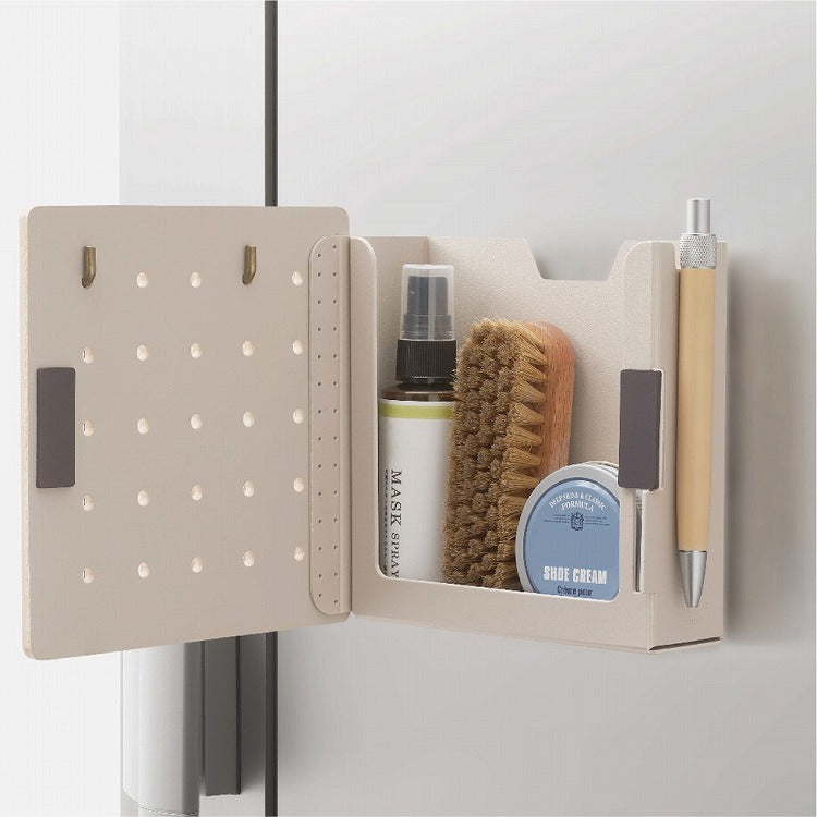フックで掛けられない物はペグボード扉の内側のスペースに収納可能。玄関に溜まりがちなDM・チラシや予備のマスク、置き場所に困るキッチンのレシピ本など厚みのある物も収納できます。扉が開くので、内側に入れた小物が取り出しやすいのも嬉しいポイントです!