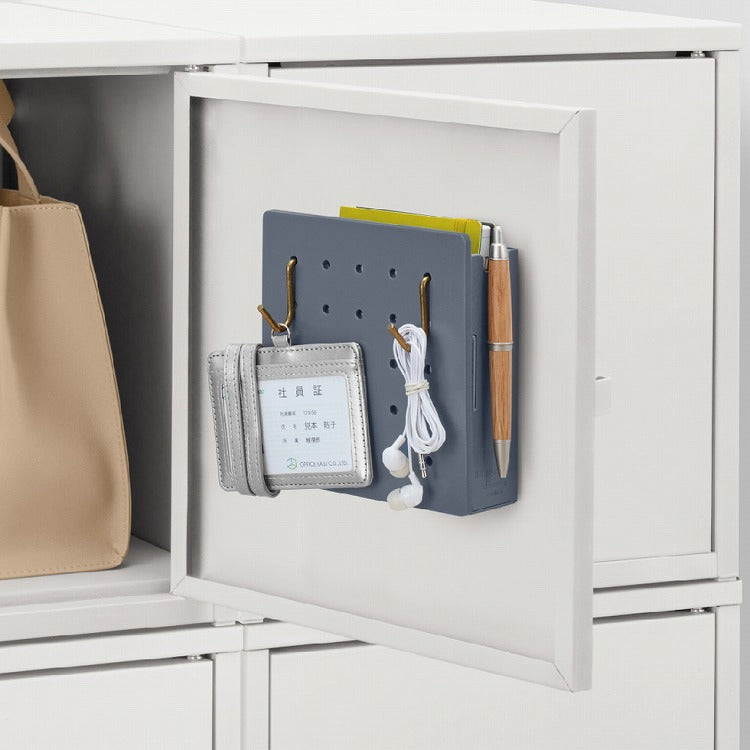 ペグボードの内側の扉開きの収納スペースには、DMやチラシなど紙類も一緒に収納可能。「見せる収納」と「隠せる収納」を同時に実現することができます。
