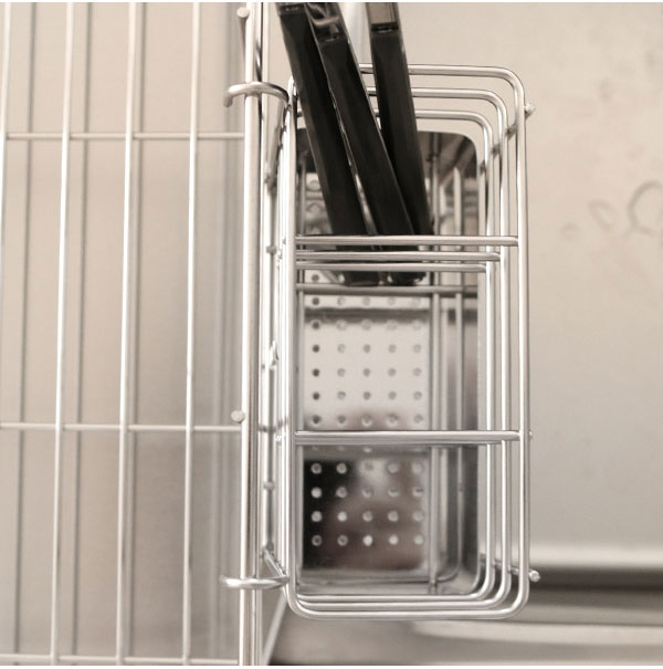コップや水筒はもちろん、布巾やまな板などキッチンで使う様々なアイテムをかけることができるグラススタンド付きです。