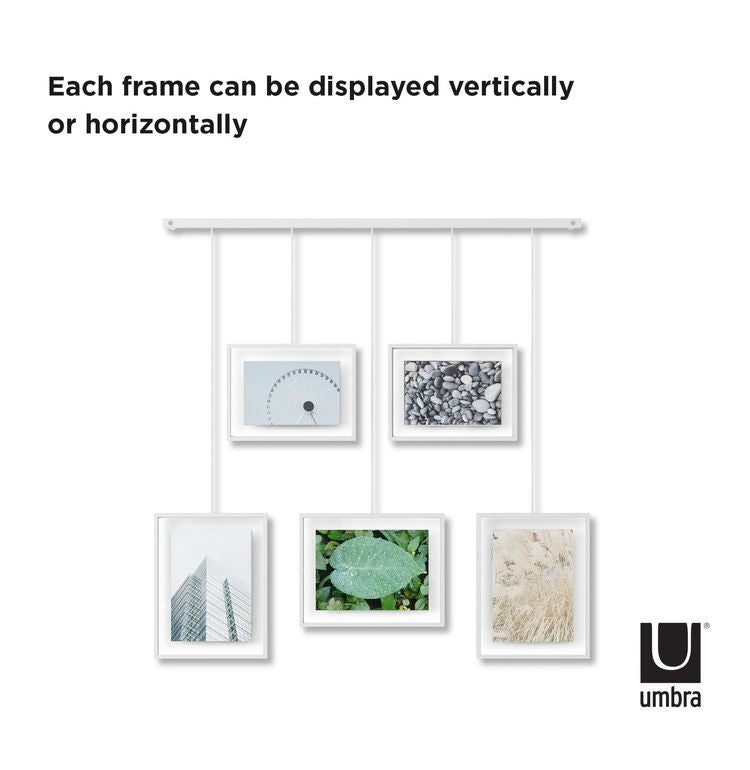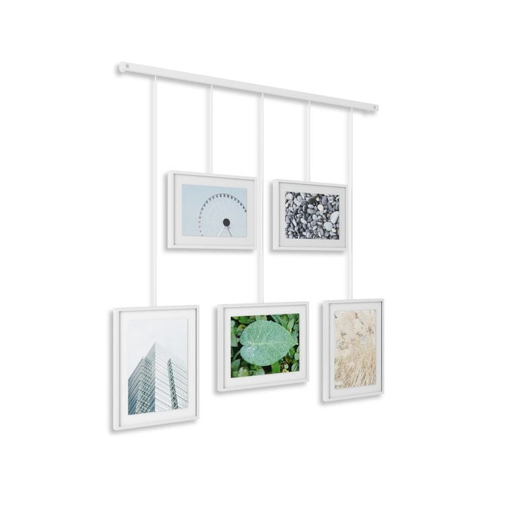 5個のフォトフレームを吊り下げたギャラリースタイルのフォトディスプレイ