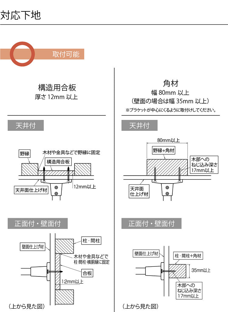 構造用合板(12mm以上)、角材(幅80mm以上(壁面の場合は35mm以上)※木部へのねじ込み深さ17mm以上、野縁(木部:垂直方向、木部へのねじ込み深さ17mm以上)、コンクリート(コンクリート用アンカープラグ使用:別途)に取り付けが可能です。