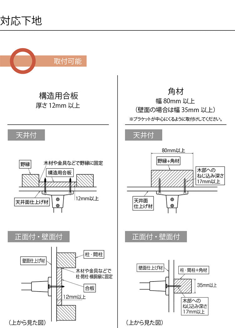 構造用合板(12mm以上)、角材(幅80mm以上(壁面の場合は35mm以上)※木部へのねじ込み深さ17mm以上、野縁(木部:垂直方向、木部へのねじ込み深さ17mm以上)、コンクリート(コンクリート用アンカープラグ使用:別途)に取り付けが可能です。