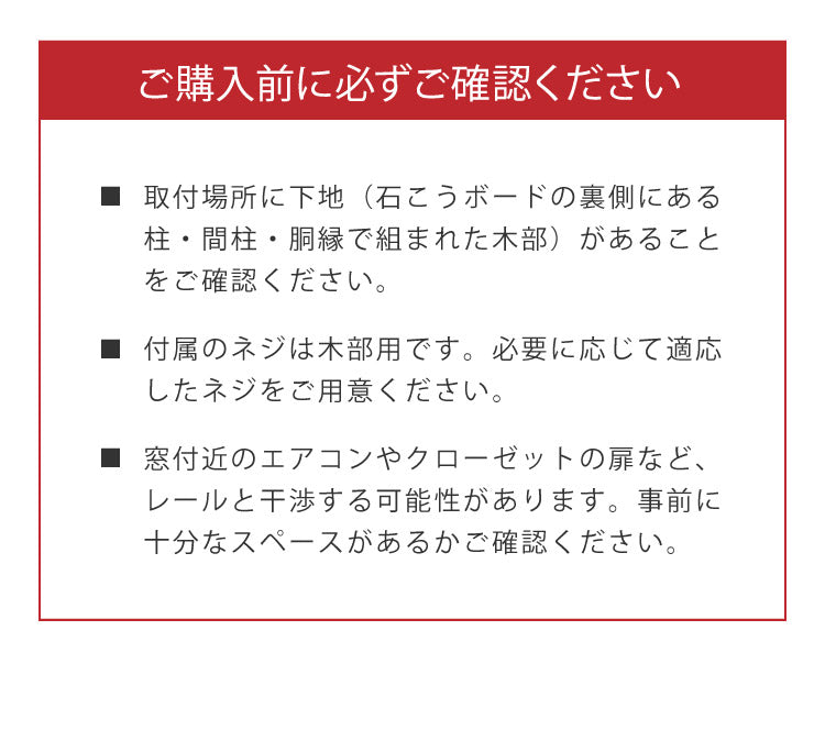 取り付けの際は必ずネジが効く下地があることをご確認ください。下地がない場所への取り付けは落下の恐れがあります。