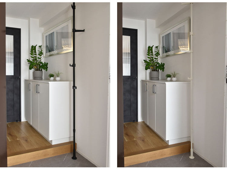 ・つっぱり棒を縦方向に使うハンガーラックです。高さが自由に調整できるため玄関やリビングのちょっとしたスペースを有効に活用いただけます。