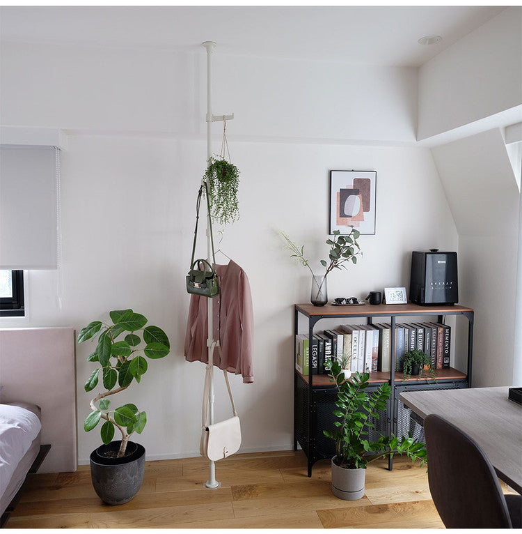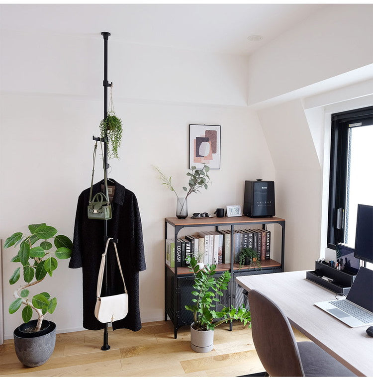 ・つっぱり棒を縦方向に使うハンガーラックです。高さが自由に調整できるため玄関やリビングのちょっとしたスペースを有効に活用いただけます。