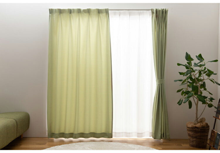 シンプルチャック柄のドレープカーテンとレースカーテンがセットされています。UVカット70%以上のレースカーテンで光を取り入れつつ気になる紫外線をカットできます。お肌や家具、フローリングを日焼けから守ってくれます。ミラー加工の効果で光の反射によって日中外から室内が見えにくく、プライバシーを確保できます。外からの視線が気になる方におすすめです!アジャスターフック(ドレープBフック・レースAフック)、ドレープカーテンの同色タッセルが付属されております。洗濯機での洗濯可能なのでお手入れも簡単です!※商品写真はできる限り実物の色に近づけるよう加工しておりますが、撮影環境やお客様のお使いのモニター設定、お部屋の照明等により実際の商品と色味が異なる場合がございます。 ご了承ください。