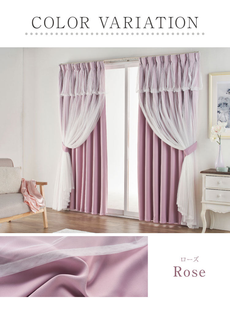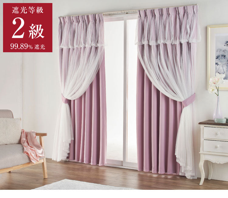 しっかり光を遮る2級遮光のドレープとやわらかなレースを組み合わせ、憧れのお姫様気分を演出するエレガントなカーテンです。