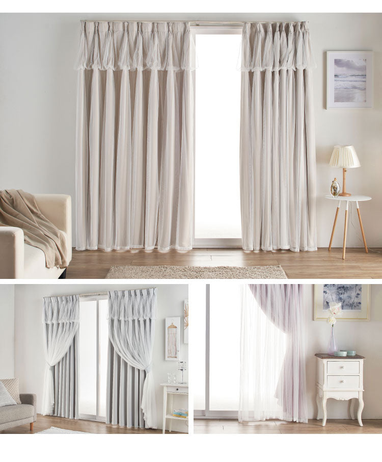 ドレープ(厚手)カーテンにレース生地を縫い付けた一体型カーテン。