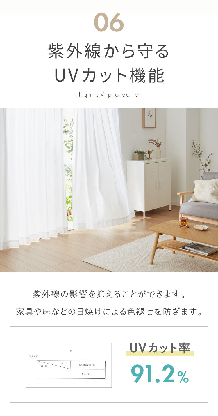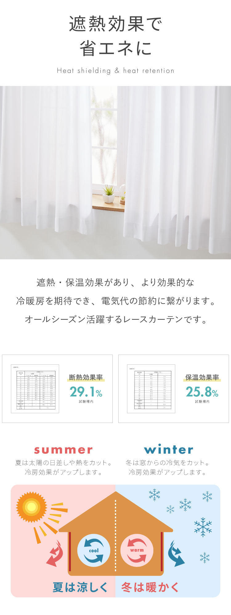 UVカット91.2%、遮熱29.1%、保温25.8%、ミラー加工(レースカーテン)