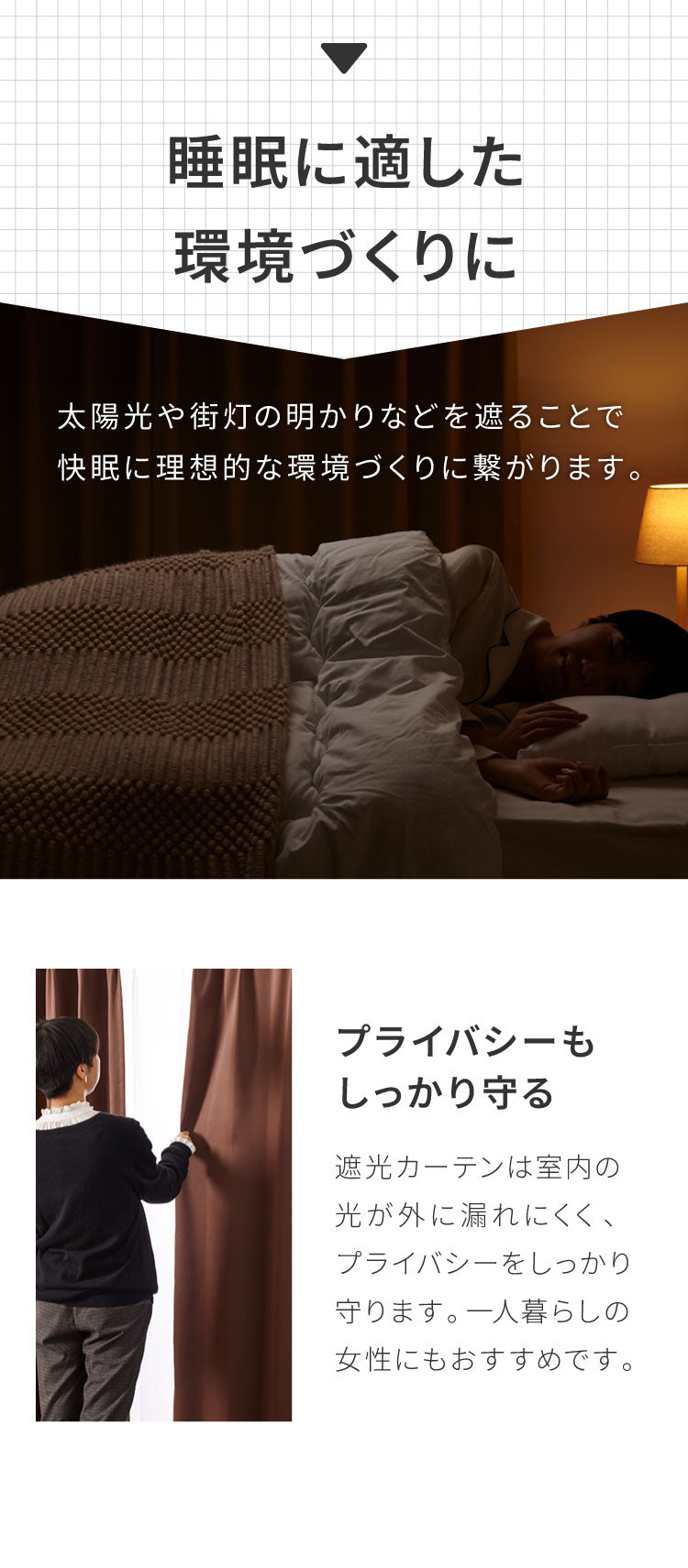 日差しや紫外線を防ぐ1級遮光のカーテンは、睡眠に適した環境をサポートします。