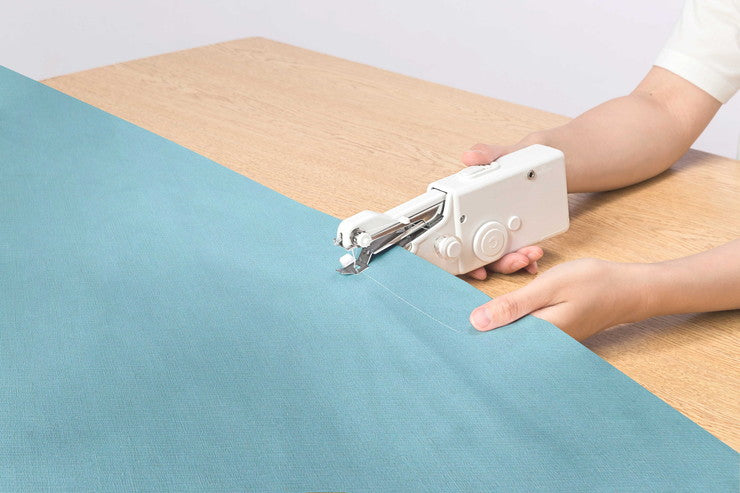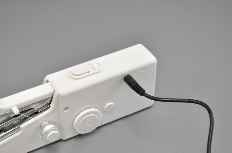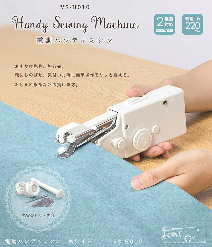 ●片手で持てる電動ハンディミシンです。小型で電池で使用できるので手軽にサッと縫えます。