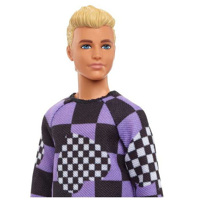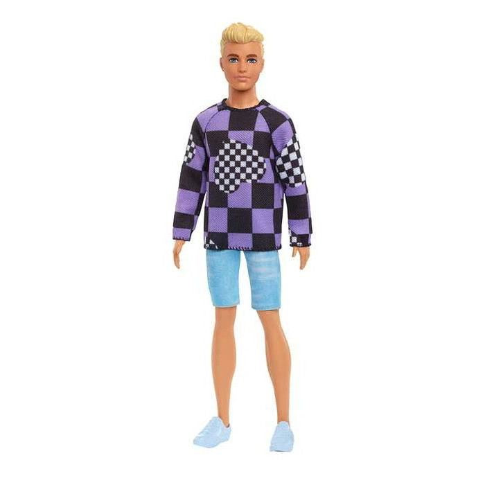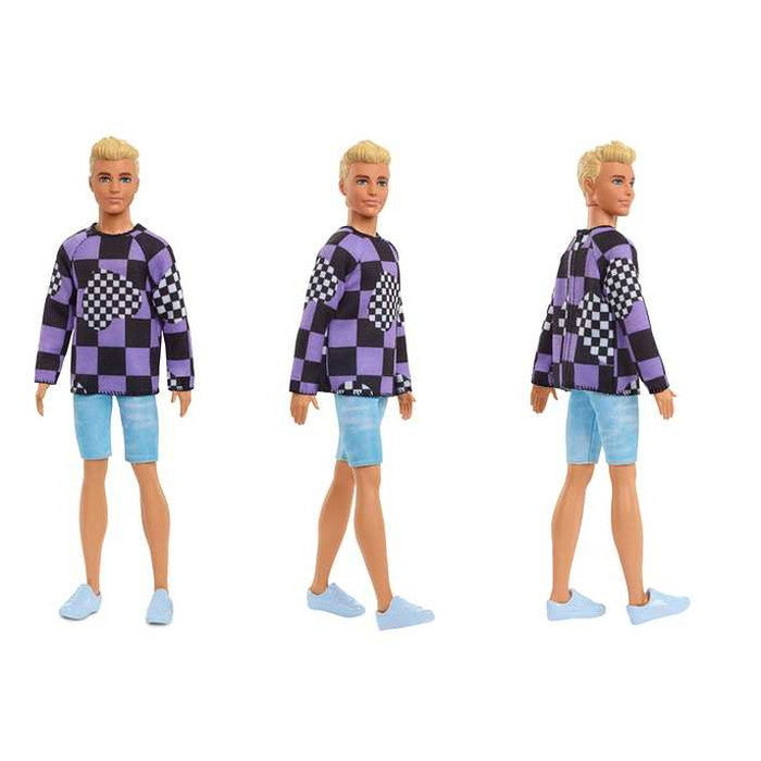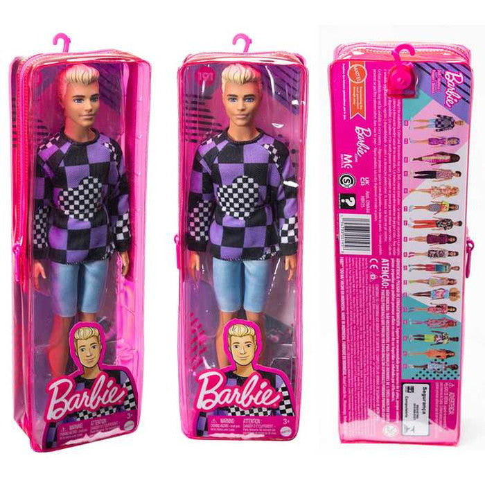 紫と黒のチェックのセーターとデニムのショートパンツに、白のスニーカーを合わせたモダンでスポーティなスタイルのケンのドールです。パッケージになっているファスナー付きのビニールバッグは、ドール、ファッション、アクセサリーを収納することができ、シールなどでカスタマイズすることも可能です。ファッショニスタシリーズはさまざまなボディタイプ、肌の色、目の色、髪の色、ヘアスタイルがミックスされ、最新のトレンドからインスピレーションを得たファッションがたくさん揃っています。