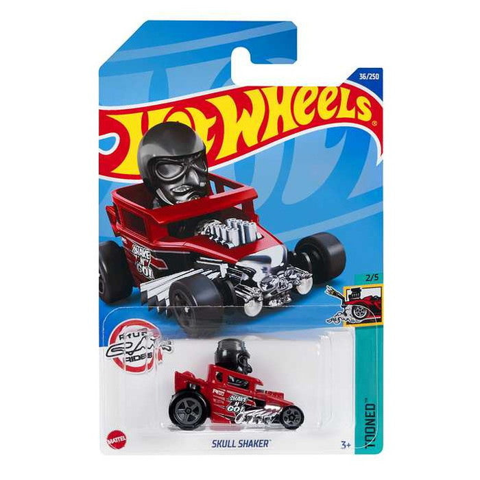 ホットウィールのオリジナルデザインカーとしては屈指の人気を誇るボーンシェイカーをオマージュしつつ、デフォルメタッチのボディに、オーバーサイズのデカ頭フィギュアをドッキングしたスカルシェイカー。車軸に組まれたカムによって、走らせるとフィギュアの頭が左右にシェイクするギミックが備わっているのがポイント。