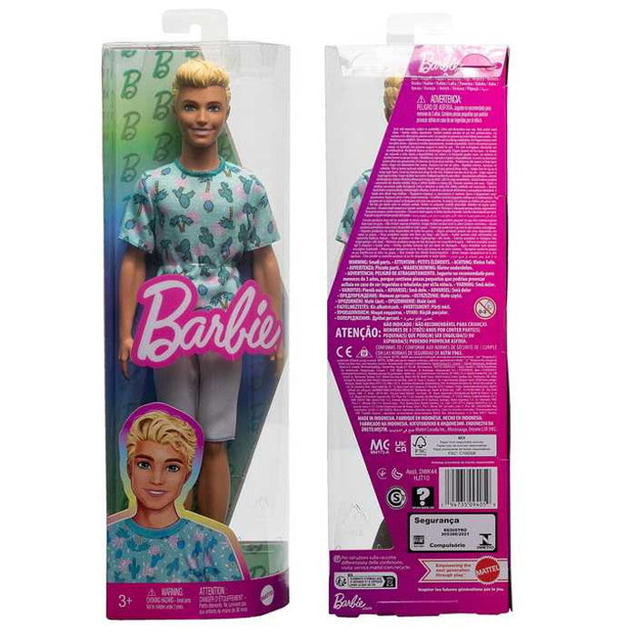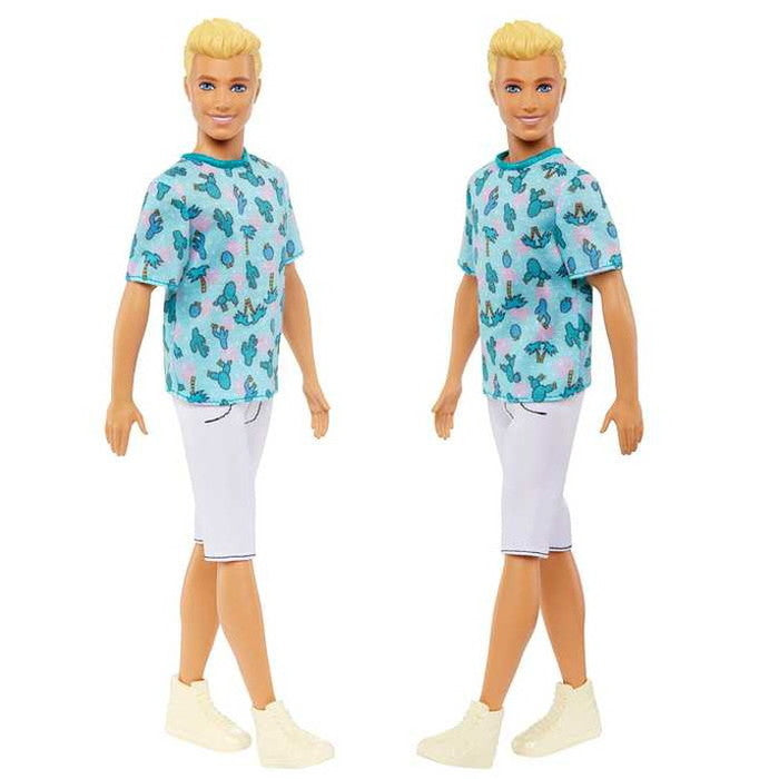 サボテンとヤシの木とサボテンのかわいいTシャツにの白のパンツとクリームカラーのハイトップスニーカーでさわやかでスポーティーなスタイルのケンのドールです。ファッショニスタシリーズはさまざまなボディタイプ、肌の色、目の色、髪の色、ヘアスタイルがミックスされ、最新のトレンドからインスピレーションを得たファッションがたくさん揃っています。