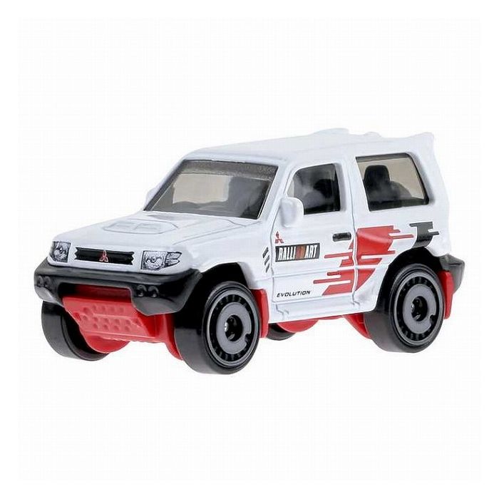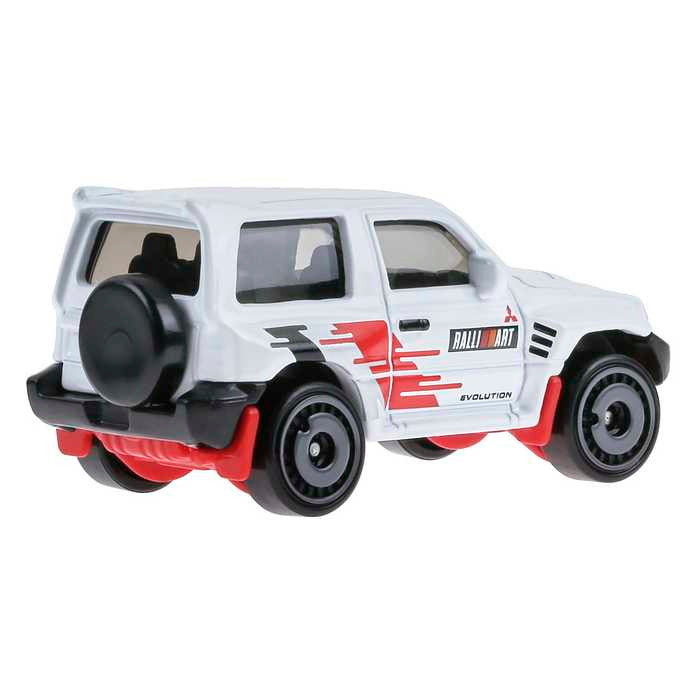 1982年、4WDピックアップトラックのシャシーにバン/ステーションワゴン型のボディを架装した新機軸モデル、パジェロは登場した。パジェロはその走破性の高さから、スキーやマリンスポーツ、アウトドアなどを楽しむ層から大人気を博し、特に2代目は日本国内の新車販売台数で大衆車などを抜いて1位に輝くなど、世のお父さんたちの憧れの存在としてパジェロ・ブームを巻き起こした。ホットウィールがモチーフにしたのはパリダカ参戦用のホモロゲ―ションモデルのエボリューションで、空気抵抗を減らすためのワイドボディやリアのウィング他、標準車とはまったく異なる印象となっている。