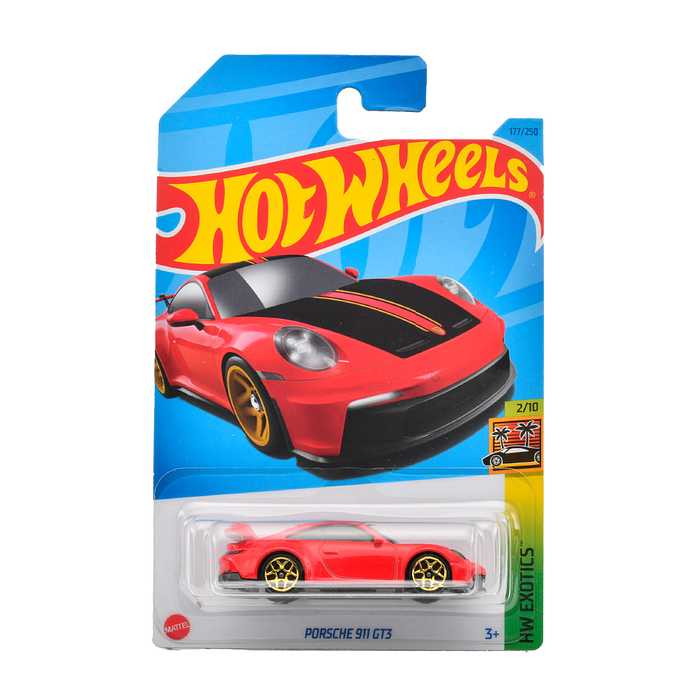 GT3はポルシェ911シリーズの最高性能仕様にして、ワンメイクレースなどの競技用ホモロゲ―ションモデルとして、第5世代の996型から設定されたグレードである。一番の特徴はターボに頼らないハイチューンの自然吸気エンジンを搭載し、後席を廃して乗車定員を2名とするなど、徹底した軽量化と車体や足回りの強化が行われていることにある。ホットウィールがモチーフにしたのは911シリーズの最新モデル、992型をベースにしたGT3で、外観上はスワンネックタイプのレーシングカーさながらのウィングが特徴となっている。
