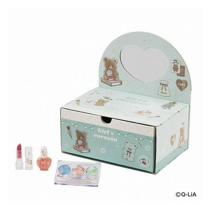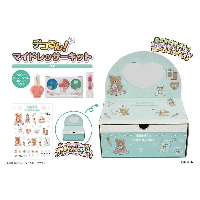 組立かんたん!はさみやのりを使わずにかわいいドレッサーが作れちゃう!容器にデザインが入っていないコスメ(リップスティック、アイシャドウ、ネイルカラー)もセットになっているので、付属のデコレーションシールで組立てたドレッサーとコスメ容器を自由にデコって、自分だけのオリジナルドレッサーとコスメを完成させよう!メイクを落とす際は、石鹸を泡立ててメイクになじませ、水またはぬるま湯で洗い落としてください。ネイルカラーは水溶性なので除光液を使わず、水で落とせます。落とす時は水またはぬるま湯で爪を軽くこすりながら落としてください。