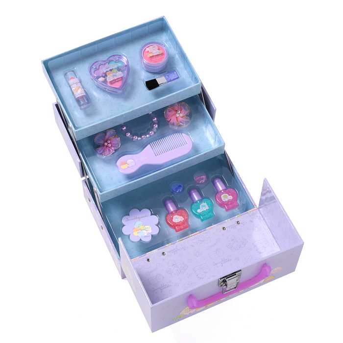 バニティボックスの中にはかわいいコスメや雑貨がいっぱい!ハート型の3色アイシャドウパレットと、ネイルカラー、チーク、リップスティックなどが揃った大人も顔負けの本格コスメセット。 これ1つで楽しくヘアメイクができちゃう♪メイクを落とす際は、石鹸を泡立ててメイクになじませ、水またはぬるま湯で洗い落としてください。ネイルカラーは水溶性なので除光液を使わず、水で落とせます。 落とす時は水またはぬるま湯で爪を軽くこすりながら落としてください。