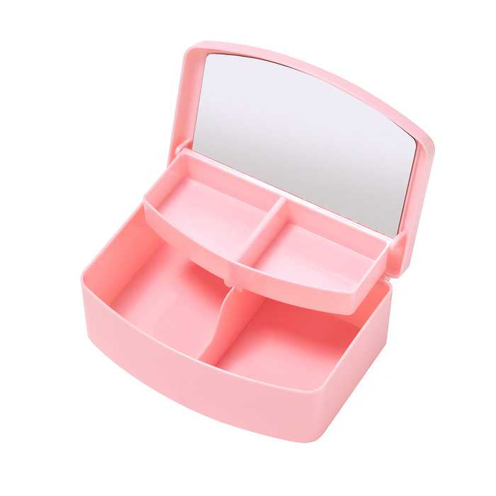 コスメボックスを開けると2段の仕切りがついていて、お気に入りのコスメやアクセサリーを可愛く収納できちゃうよ。フタにはミラーもついているからとっても便利♪ハート型がかわいい3色アイシャドウに、リップスティック、ネイルカラーと、ヘアゴムやリングも入っているから、これでヘアメイクもばっちり!自分用やプレゼントにもおすすめです。メイクを落とす際は、石鹸を泡立ててメイクになじませ、水またはぬるま湯で洗い落としてください。ネイルカラーは水溶性なので、落とすときは水またはぬるま湯の中で爪を軽くこすりながら落としてください。除光液を使わなくていいのでお子様でも安心してお使いいただけます。