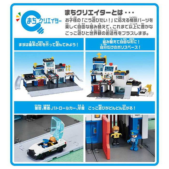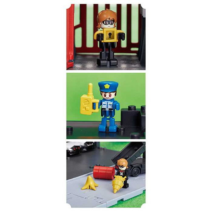事件発生!DXポリスベースからパトロールカー緊急出動!建物や情景パーツの自由な組み替え遊びでキミだけのストーリーをつくろう!警官、悪者の2体の人形とパトロールカー、ダンプトラック付き。