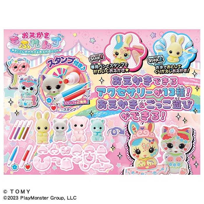 たくさんきせかえ&おえかきセットは、ドール4体、細ペン4本(ピンク、パープル、イエローグリーン、ブラウン)、スタンプ付き太ペン2本(「おはな(ブルー)」「ハート(レッド)」)、さらにおえかきができるアクセサリーが13種入っている、ごっこ遊びにもおすすめな商品です。何回でも繰り返し自由におえかきを楽しもう♪