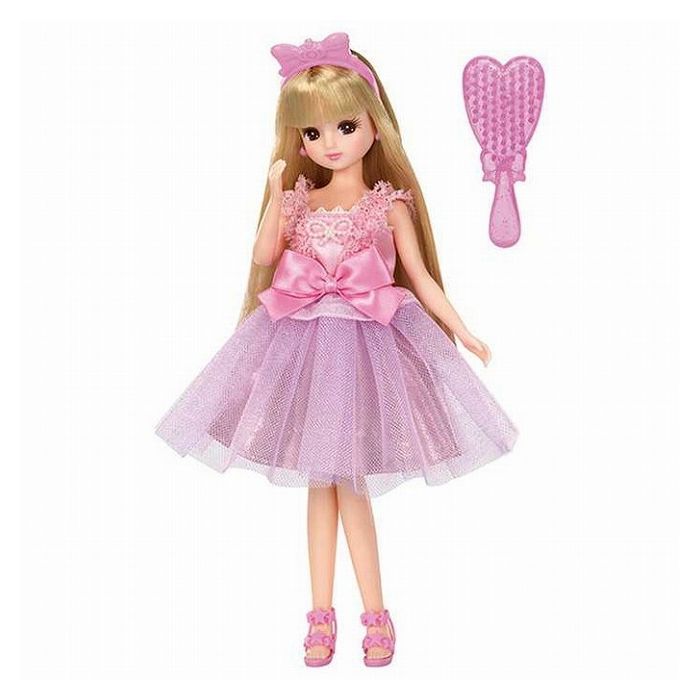 リカちゃん人形遊びのスターターセット。ブラシ、カチューシャ付きで、おしゃれ基本遊びが楽しめます。ピンク&パープルの素敵なドレスデザイン♪お買い求めやすいドールセットです。