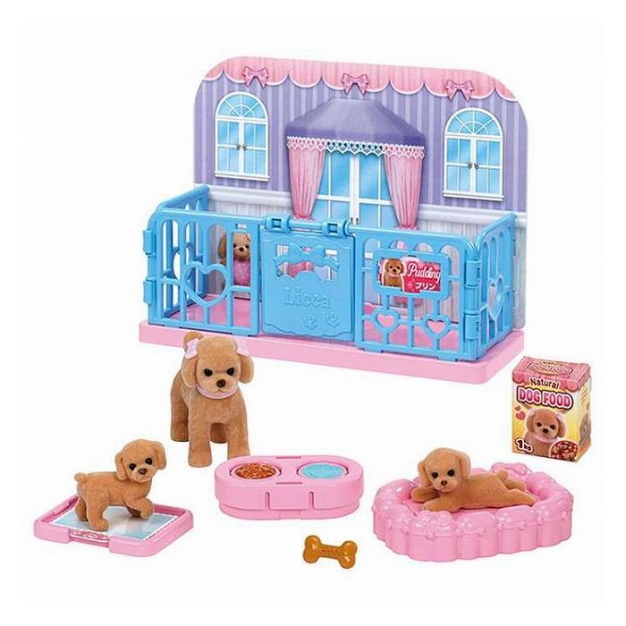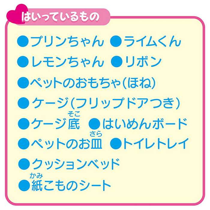 フワフワの手触りが気持ちいいプリンちゃんたち。ドアが開くケージタイプのお部屋で遊んだり、クッションベッドでお昼寝したり。フード皿はくるくる回転して「ゴハン⇔はみがきガム」「お水⇔からっぽ」と変化が楽しめます。トイレシートの交換もできて、ペットお世話小物が充実のセットです。