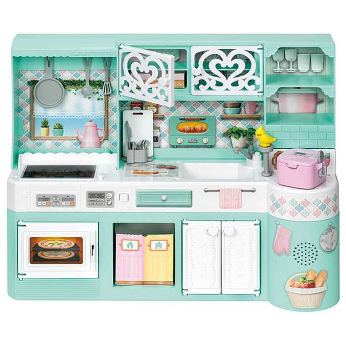 オカメインコのピーちゃんがおしゃべりしたり、IHクッキングヒーターやオーブン、カウンターのスイッチを押すとお料理の音や家電の音声ガイダンス、蛇口スイッチを押すとお水が流れる音がします。フライパンや片手鍋、包丁とまな板などのキッチン小物の他、美味しそうなお料理小物もたくさん。飾り棚や扉つきの吊戸棚、シンク下にも収納でき、遊び終わったらお片付けもできます。