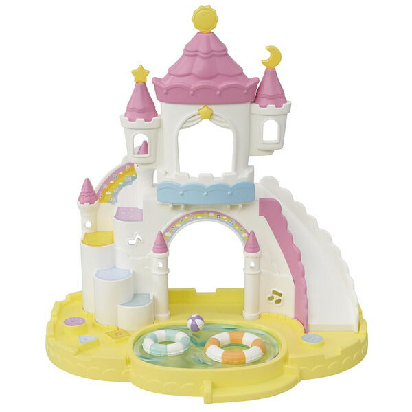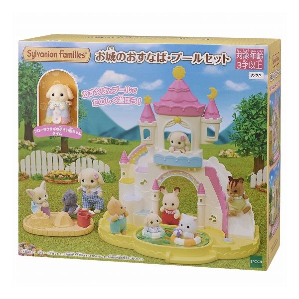 ほいくえんにぴったりのすなばとプールのセットです。フローラウサギの小さい赤ちゃんがついています。赤ちゃんたちが顔を出せる窓があるお城には、大きなすべり台がついています。すなばやプールで遊べる、バケツ、スコップ、ボールなどの楽しい小物もついています。プールのうきわには、赤ちゃんと小さい赤ちゃんを入れて遊ぶことが出来ます。