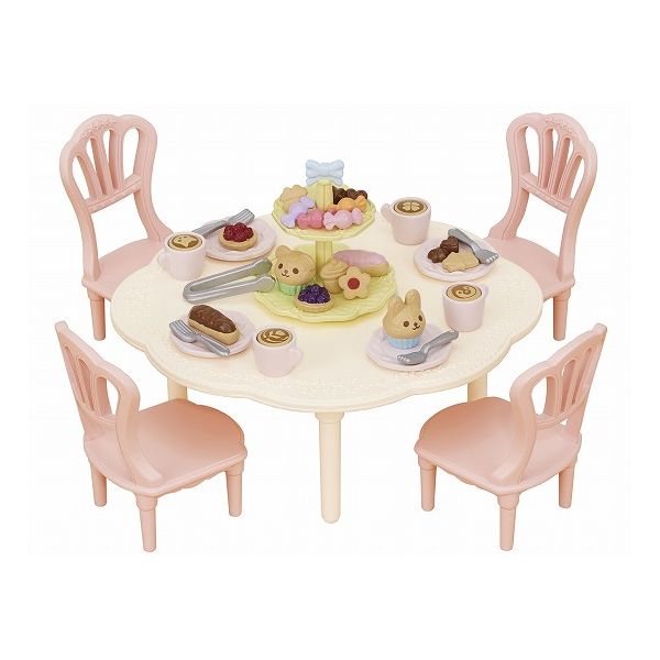 華やかなテーブルといすに、カラフルでかわいいスイーツがいっぱいついたパーティーセットです。かわいいスイーツ小物が30こもついています!かわいいモチーフのスイーツの他、4種類のラテアートのカフェラテもあります。スイーツスタンドにはたくさんのスイーツを全て並べられます。