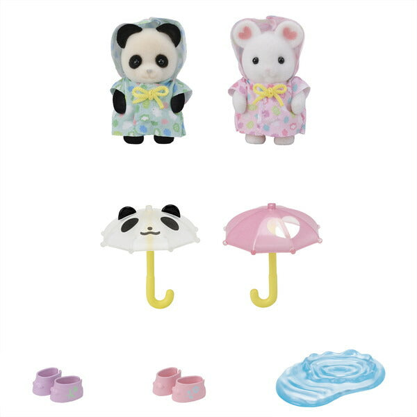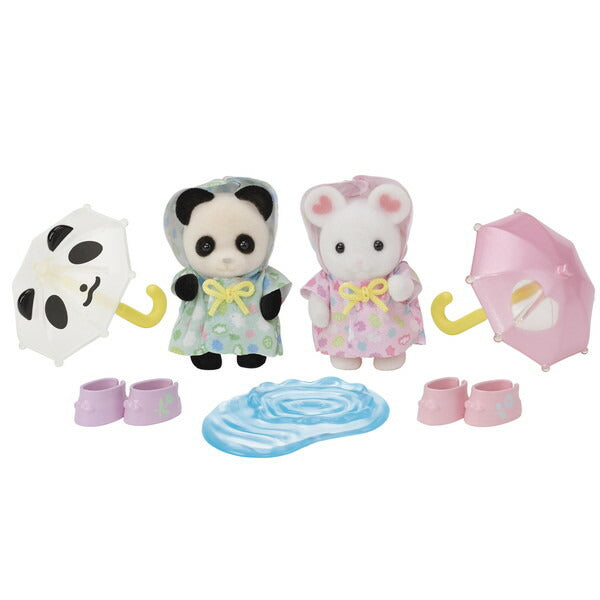 ほいくえんにぴったりの、雨がテーマの赤ちゃんふたりセットです。かわいいかさや長ぐつ、水たまりで雨の日のお散歩シーンを楽しむことができます。かさは赤ちゃんの手に持たせることができます。赤ちゃんは雲の模様がかわいいレインコートを着ています。長ぐつは赤ちゃんに履かせることができます。