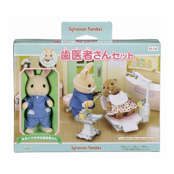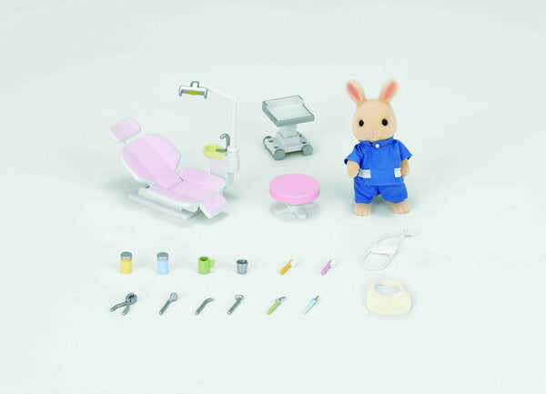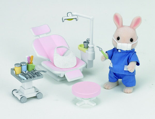 お医者さんのごっこ遊びをさらに充実させる周辺アイテムです。歯医者さんの服を着たみるくウサギのお父さん、診療いす、治療器具などごっこ遊びに必要な小物がそろったセットです。お医者さん本体と合わせて遊ぶことができます。