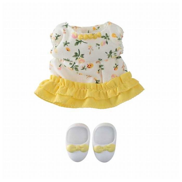 お母さん用のきせかえです。おしゃれなワンピースは、きいろいフリルがポイント。お買い物がますますたのしくなりそう♪