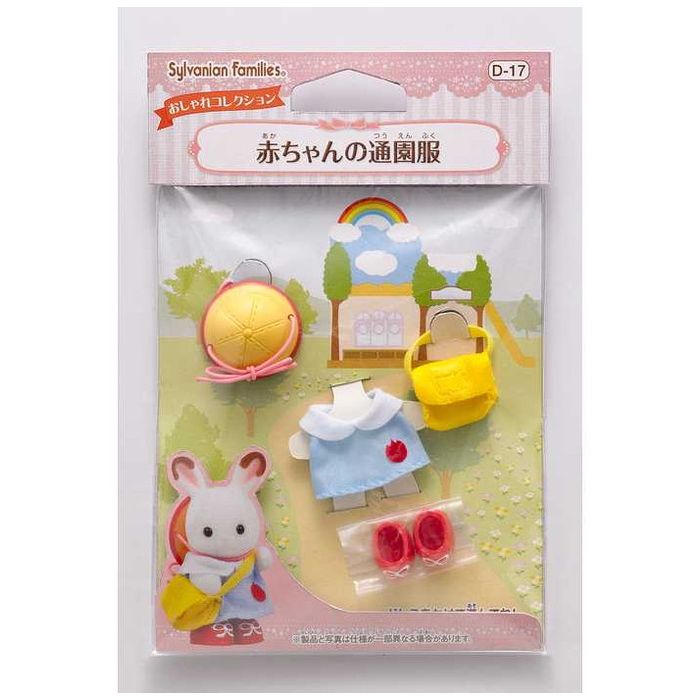 ようちえんの通園服です。赤い靴と帽子のリボンがポイントです。ようちえん遊びがさらにお楽しみいただけます。