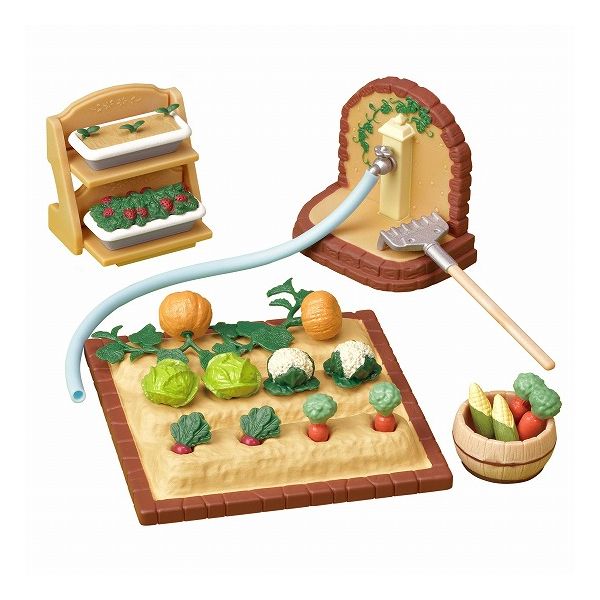 レンガでかこまれた畑には、にんじんやかぼちゃ、カリフラワーなど、いろいろな野菜をセットできるよ。プランターのふたばやいちごも、とってもかわいい!